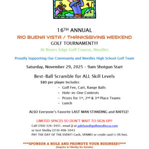 16th Annual Rio Buena Vista/Thanksgiving Weekend Golf Tournament Proudly Supporting Our community and Needles High School Golf Team Saturday, November 29th 2025 – 9:00am (CA) Shotgun Start 4-Person Scramble – $80 per person Includes Golf, Cart, Range, On-Course Prizes & Payouts Call (760) 326-3931 to sign up today!