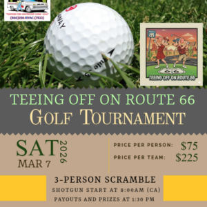 Teeing Off on Route 66 Golf Tournament Saturday, March 7th 2026 8:00am (CA) Shotgun Start – 3-Person Scramble $75 per player includes Golf, Cart, Range Balls, Prizes & Payouts Call Rivers Edge Pro Shop at (760) 326-3931